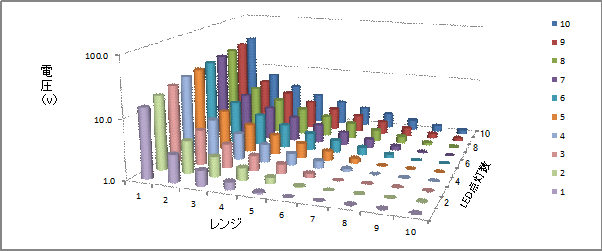 | 定量測定が必要な場合は、下表によって換算することが可能です。 LEDの点灯数と電圧換算(単位:V) ![]() レンジ1は、感度最小(増幅度最小)・・・・・これでLEDは10個点灯する電圧は36.9V レンジ10は、感度最大(増幅度最大)・・・・・これでLEDは1個点灯する電圧は0.47V 0.47V~36.9Vの範囲のPZTの電圧を測定 ![]() | |||||||||||||||||||
