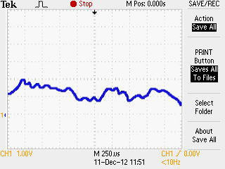 ![]() 図2.従来の音圧計の生波形 | ○従来の超音波音圧計 従来の音圧計では、図2に示す様にローパスフィルターでスパイクを消して、 直流波形にして、遅い針式のメーターで表示しています。 これでは超音波振動の①基本エネルギーのみを表示し、②キャビテーションに よる衝撃エネルギーが全く消えてしまいます。 | ||||||||||||||||||